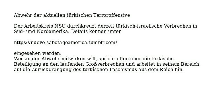 Türkische Terroroperationen in Südamerika Verfasst vongeheimschreiber8. Juni 2020Veröffentlicht inTerrorismusSchlagwörter:Abwehr, Dönertürke, Faschismus, Israel, Türkei, Terrorismus Verweis Nuevo Sabotageamerica Teilen mit: Auf X teilen (Wird in neuem Fenster geöffnet) X Auf Facebook teilen (Wird in neuem Fenster geöffnet) Facebook Gefällt mir Wird geladen … Ähnliche Beiträge Veröffentlicht von geheimschreiber Geboren 1975, Nationalist, lebt in Berlin. Mehr Beiträge anzeigen