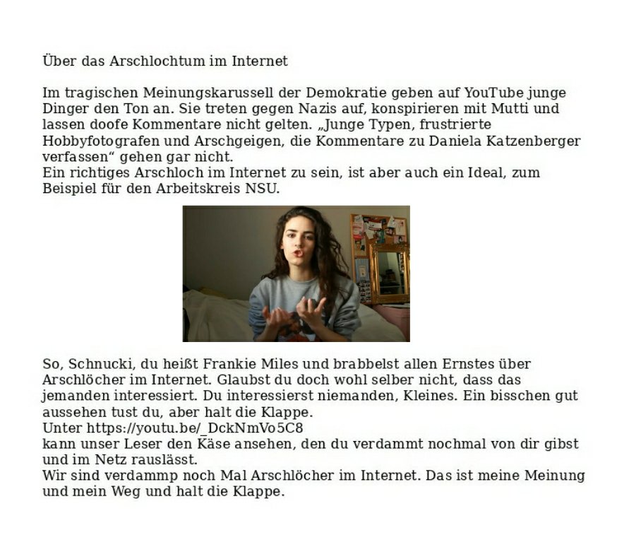 Arschlöcher im Internet Verfasst vongeheimschreiber11. Juni 202011. Juni 2020Veröffentlicht inLiebeSchlagwörter:Blaustrumpf, Frankie Miles, Internet, Meinung, Model, YouTube Verweis zum Video und toller Instagram-Account Teilen mit: Auf X teilen (Wird in neuem Fenster geöffnet) X Auf Facebook teilen (Wird in neuem Fenster geöffnet) Facebook Gefällt mir Wird geladen … Ähnliche Beiträge Veröffentlicht von geheimschreiber Geboren 1975, Nationalist, lebt in Berlin. Mehr Beiträge anzeigen
