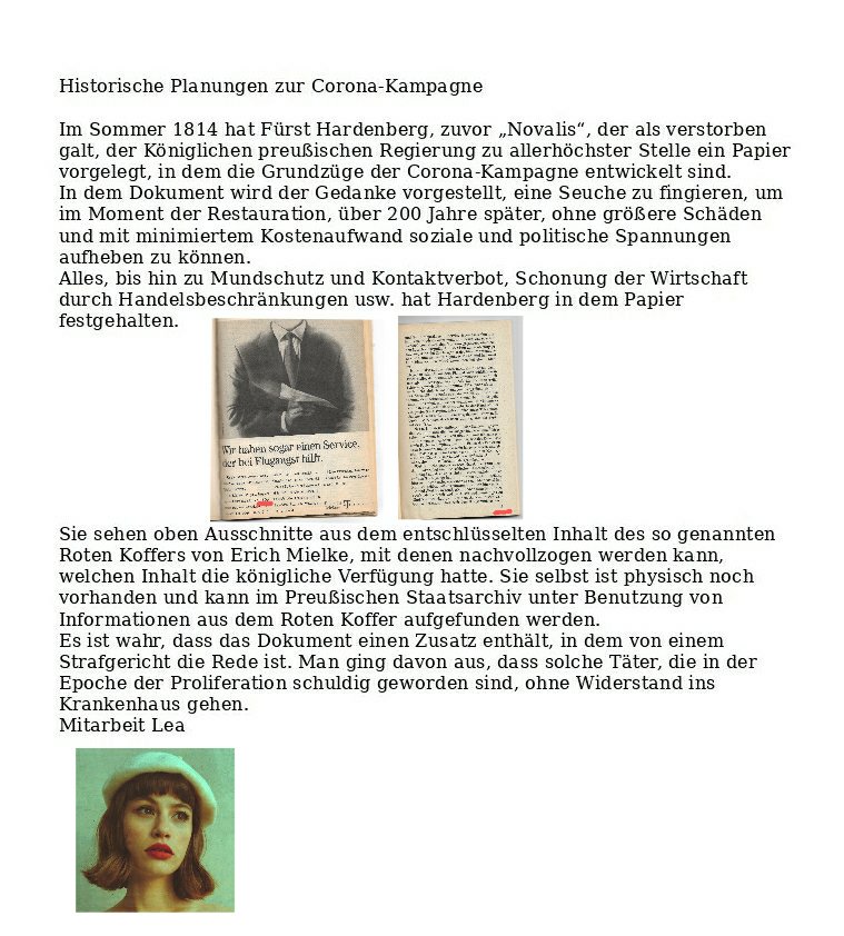 Corona 1814 geplant und genehmigt Verfasst vongeheimschreiber14. Juni 2020Veröffentlicht inBefehleSchlagwörter:1814, Corona, Geschichte, Hardenberg, Krieg, Planung, Preußische Geheimpolizei, Strafgericht Aus Sicherheitsgründen sind Abbildungen der Dokumente nicht in besserer Qualität verfügbar als hier zu sehen. Teilen mit: Auf X teilen (Wird in neuem Fenster geöffnet) X Auf Facebook teilen (Wird in neuem Fenster geöffnet) Facebook Gefällt mir Wird geladen … Ähnliche Beiträge Veröffentlicht von geheimschreiber Geboren 1975, Nationalist, lebt in Berlin. Mehr Beiträge anzeigen