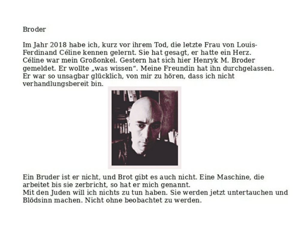 Henryk M. Broder Verfasst vongeheimschreiber5. Juli 2020Veröffentlicht inJudentumSchlagwörter:Antisemitismus, Céline, Henryk M. Broder, Juden Teilen mit: Auf X teilen (Wird in neuem Fenster geöffnet) X Auf Facebook teilen (Wird in neuem Fenster geöffnet) Facebook Gefällt mir Wird geladen … Ähnliche Beiträge Veröffentlicht von geheimschreiber Geboren 1975, Nationalist, lebt in Berlin. Mehr Beiträge anzeigen