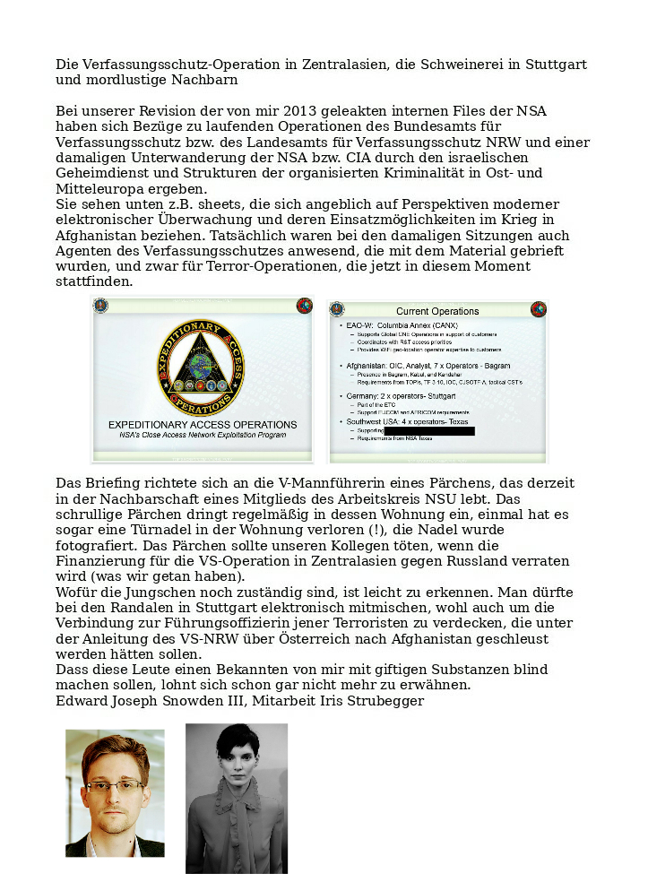 Snowden: Der Verfassungsschutz in Zentralasien Verfasst vongeheimschreiber16. Juli 2020Veröffentlicht inTerrorismusSchlagwörter:Afghanistan, Briefing, Edward Snowden, Iris Strubegger, Krieg, Mord, Terrorismus, Verfassungsschutz Verweis zum Original-Dokument, zu Snowden vorangegangenem Artikel und zu unserem Zentralasien-Projekt (abgeschlossen) Teilen mit: Auf X teilen (Wird in neuem Fenster geöffnet) X Auf Facebook teilen (Wird in neuem Fenster geöffnet) Facebook Gefällt mir Wird geladen … Ähnliche Beiträge Veröffentlicht von geheimschreiber Geboren 1975, Nationalist, lebt in Berlin. Mehr Beiträge anzeigen
