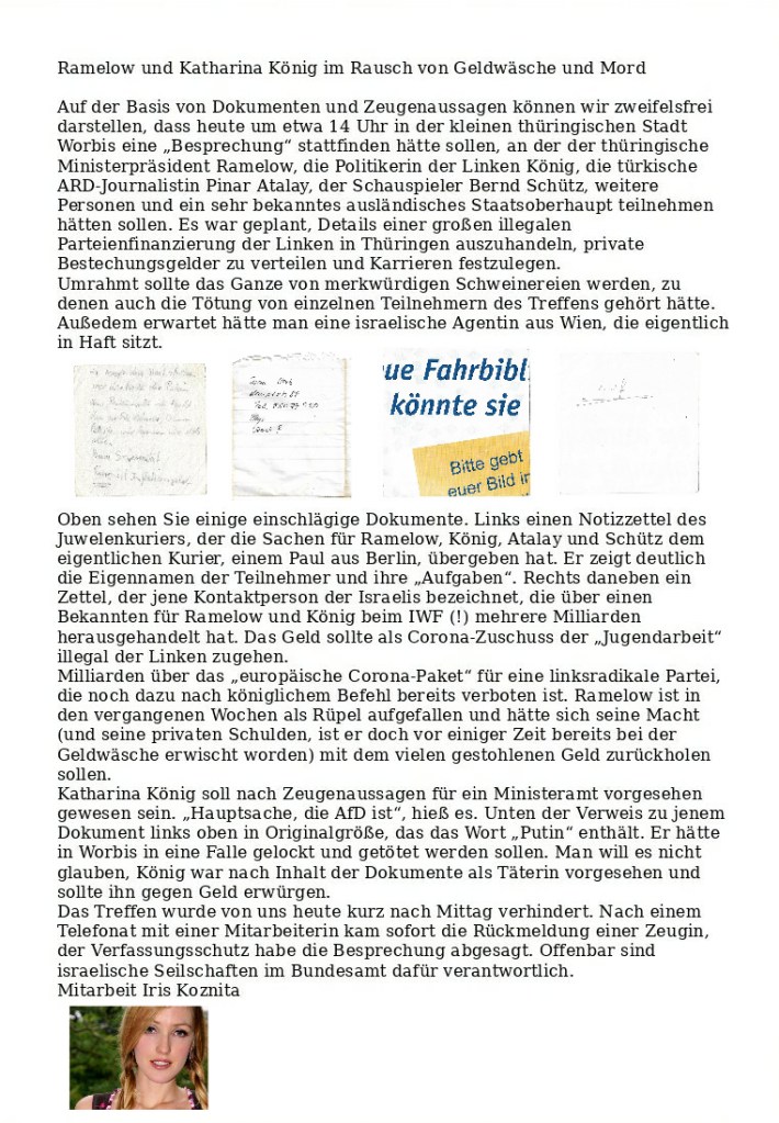 Riesenskandal um Mord und Parteienfinanzierung bei der Thüringer Linken Verfasst vongeheimschreiber24. Juli 202024. Juli 2020Veröffentlicht inParteienfinanzierungSchlagwörter:Bodo Ramelow, Corona, Die Linke, Geldwäsche, Katharina König, Mord, Thüringen Verweis zum besagten Original-Dokument Teilen mit: Auf X teilen (Wird in neuem Fenster geöffnet) X Auf Facebook teilen (Wird in neuem Fenster geöffnet) Facebook Gefällt mir Wird geladen … Ähnliche Beiträge Veröffentlicht von geheimschreiber Geboren 1975, Nationalist, lebt in Berlin. Mehr Beiträge anzeigen