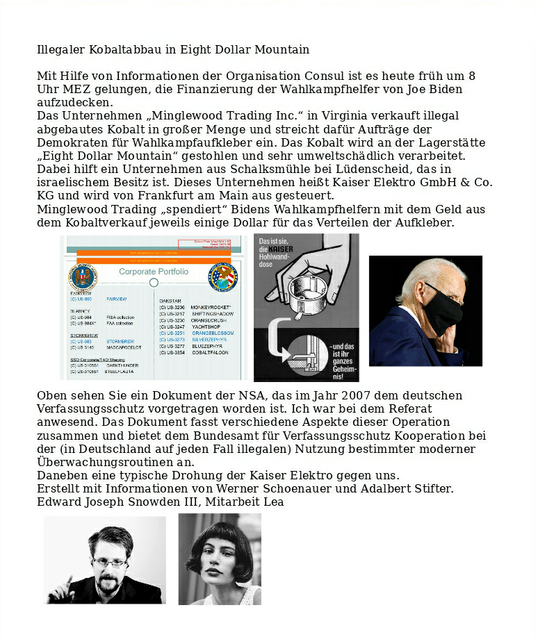 Illegale Finanzierung von Bidens Wahlkampfhelfern Verfasst vongeheimschreiber14. August 202014. August 2020Veröffentlicht inParteienfinanzierungSchlagwörter:Diebstahl, Edward Snowden, Eight Dollar Mountain, Joe Biden, Kobalt, Umweltverschmutzung, USA, Wahlkampf Verweis zu Snowdens letztem Artikel Teilen mit: Auf X teilen (Wird in neuem Fenster geöffnet) X Auf Facebook teilen (Wird in neuem Fenster geöffnet) Facebook Gefällt mir Wird geladen … Ähnliche Beiträge Veröffentlicht von geheimschreiber Geboren 1975, Nationalist, lebt in Berlin. Mehr Beiträge anzeigen