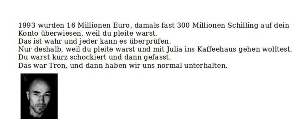 Tron legt los Verfasst vongeheimschreiber15. August 202015. August 2020Veröffentlicht inNovalisSchlagwörter:Arbeitskreis NSU, Boris Floricic, Deutschland, Geheimpolizei, Informatik, Tron Schreibt mir doch. Ich bin Tron und nicht Gott. Teilen mit: Auf X teilen (Wird in neuem Fenster geöffnet) X Auf Facebook teilen (Wird in neuem Fenster geöffnet) Facebook Gefällt mir Wird geladen … Ähnliche Beiträge Veröffentlicht von geheimschreiber Geboren 1975, Nationalist, lebt in Berlin. Mehr Beiträge anzeigen