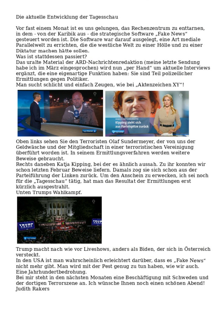 Judith Rakers: Aktuelle Entwicklung der Tagesschau Verfasst vongeheimschreiber30. August 2020Veröffentlicht inAktuellSchlagwörter:Donald Trump, Fake News, Judith Rakers, Katja Kipping, Tagesschau, Tagesthemen Verweis zur zitierten Ausgabe der Tagesschau Teilen mit: Auf X teilen (Wird in neuem Fenster geöffnet) X Auf Facebook teilen (Wird in neuem Fenster geöffnet) Facebook Gefällt mir Wird geladen … Ähnliche Beiträge Veröffentlicht von geheimschreiber Geboren 1975, Nationalist, lebt in Berlin. Mehr Beiträge anzeigen