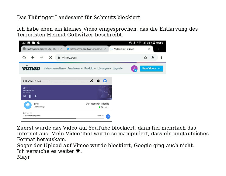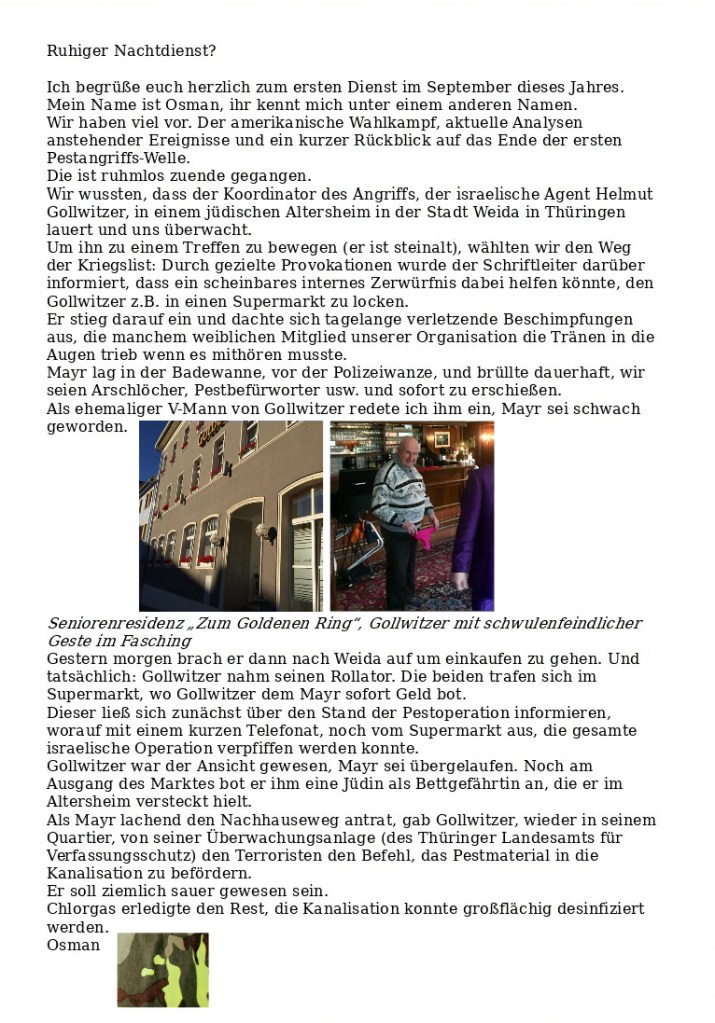 Schicksalswahl in den USA Verfasst vongeheimschreiber1. September 20202. September 2020Veröffentlicht inAktuellSchlagwörter:Edward Snowden, Helmut Gollwitzer, Musik, Nacht, Pest, USA Und los geht’s mit Osman im Nachtdienst 🤡 höhere Auflösung der Aufnahme von Gollwitzer Verweis zum „Autorenprofil“ der Täterin Jessica Hellwig, dem Klofräulein, das uns noch kennen lernen wird ciao 🤡 Teilen mit: Auf X teilen (Wird in neuem Fenster geöffnet) X Auf Facebook teilen (Wird in neuem Fenster geöffnet) Facebook Gefällt mir Wird geladen … Ähnliche Beiträge Veröffentlicht von geheimschreiber Geboren 1975, Nationalist, lebt in Berlin. Mehr Beiträge anzeigen