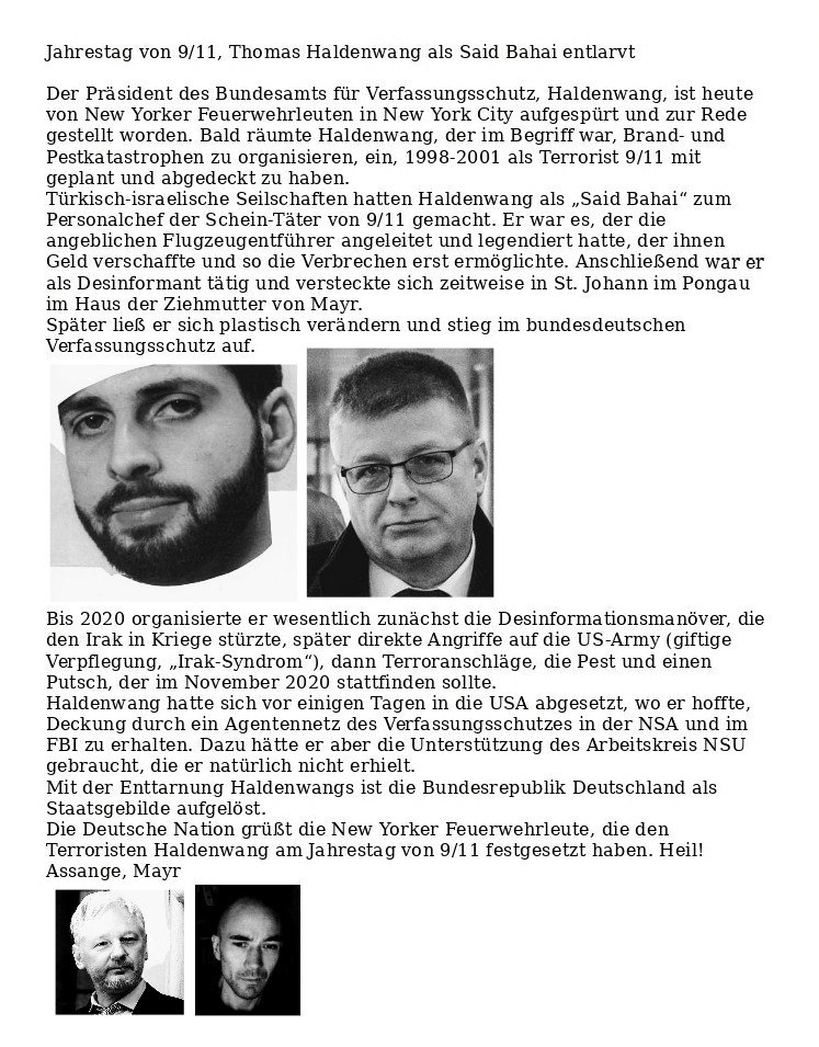 VS-Haldenwang ein operierter 9/11-Täter Verfasst vongeheimschreiber11. September 202012. September 2020Veröffentlicht inTerrorismusSchlagwörter:9/11, Artus, Bundesamt für Verfassungsschutz, Gera, Thomas Haldenwang Frisch auf 🐗 Mit meinem Segen, Matt 🐗 Teilen mit: Auf X teilen (Wird in neuem Fenster geöffnet) X Auf Facebook teilen (Wird in neuem Fenster geöffnet) Facebook Gefällt mir Wird geladen … Ähnliche Beiträge Veröffentlicht von geheimschreiber Geboren 1975, Nationalist, lebt in Berlin. Mehr Beiträge anzeigen