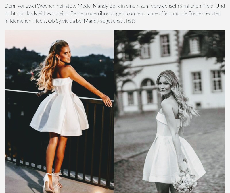 Bei Reichsfrauenführerin Mandy Bork (rechts) soll abgekupfert worden sein, meint eine Klatschzeitung. Sylvie Meis, eine Fußballertusse, soll ihr das Kleid nachgemacht haben. Angeblich hat Bork ja nicht al-Tikriti geheiratet… doch woher der Eifer der Zeitung?