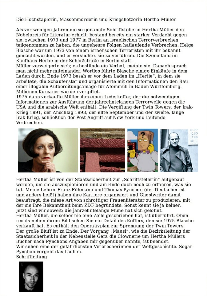 Hertha Müller: Hochstaplerin und Massenmörderin Verweis zu einem Artikel über Hertha Müllers Lederkoffer und zu einem Bericht über den Pest-Angriff auf New York