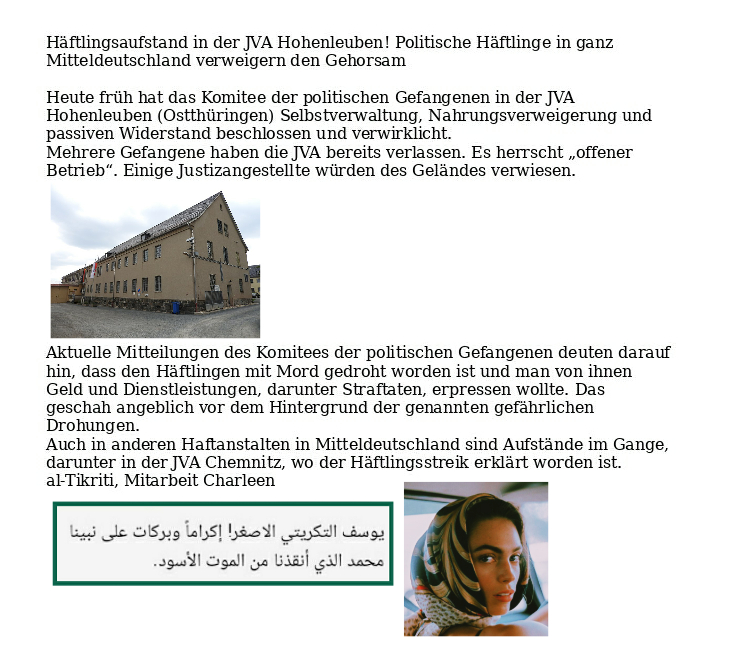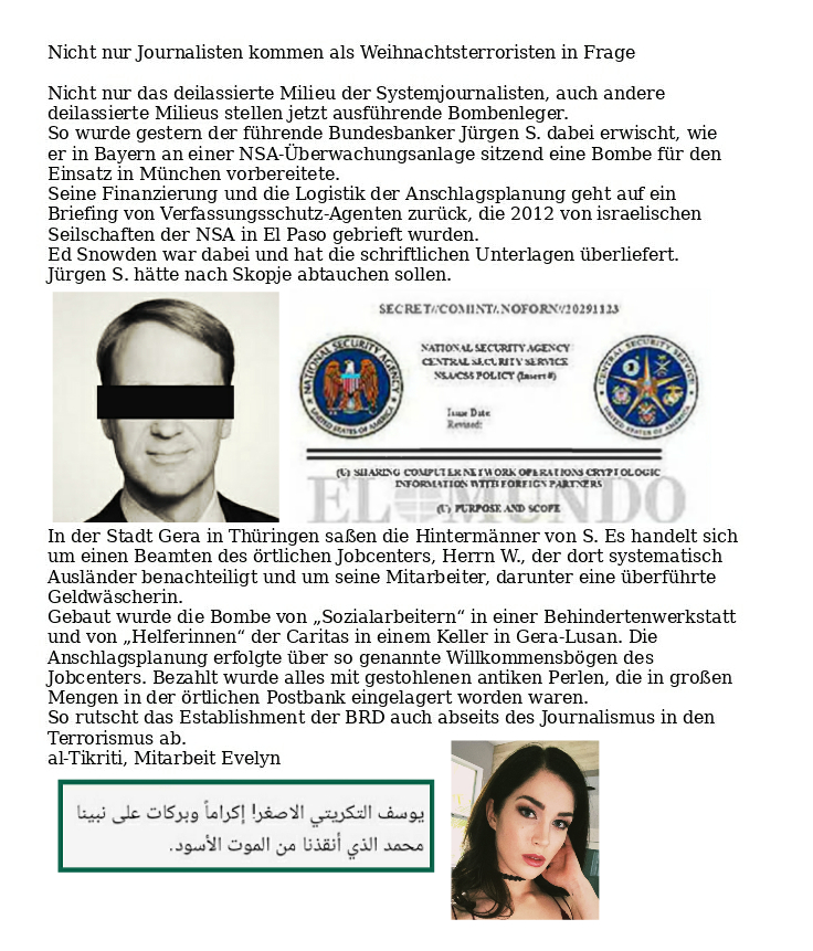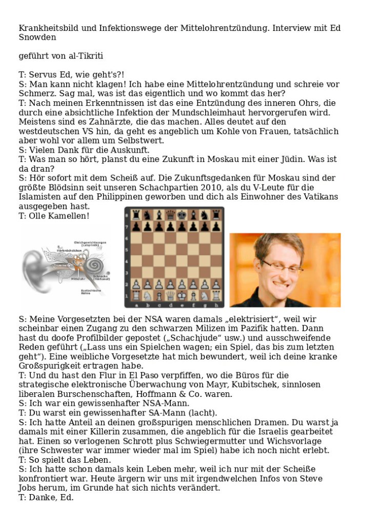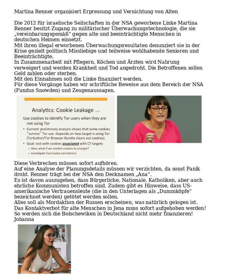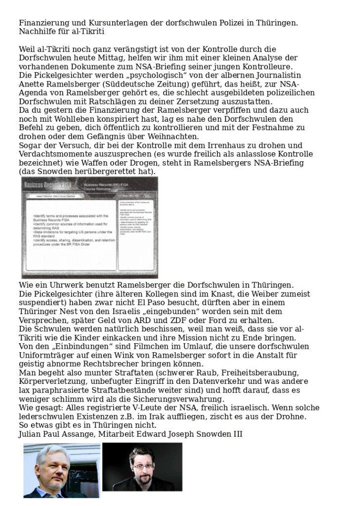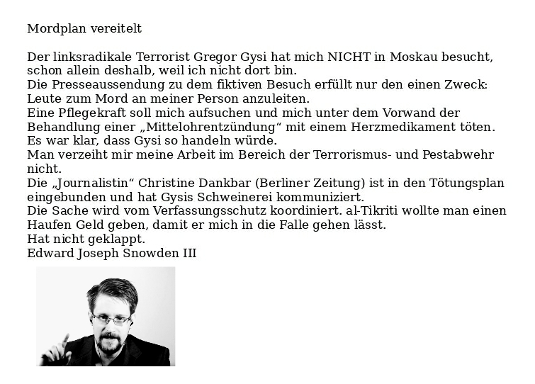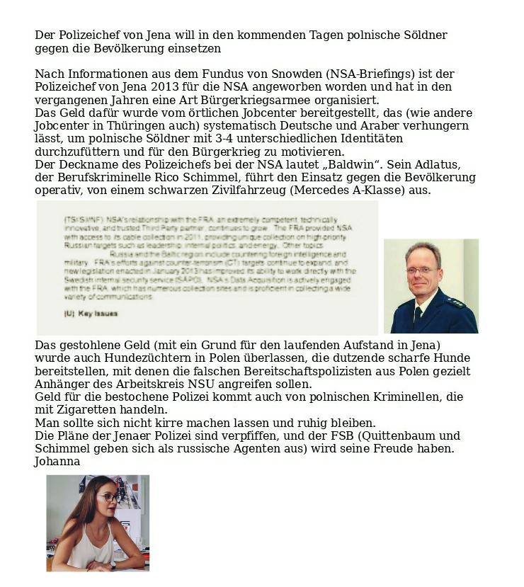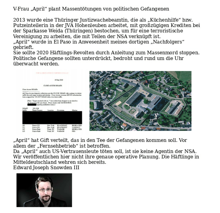 Für den Fall, dass wir den Häftlingen gegen die Giftmischerin helfen, ist die sofortige Wegsperrung von Snowden und al-Tikriti geplant und bezahlt. Eine tschechische Hochstaplerin namens Trommer-Wentzel aus Gera (vorgebliche Irrenärztin, tatsächlich ehemalige Stripperin aus Budweis) soll die beiden umgehend von Pflegern festnehmen und in die Irrenanstalt Stadtroda bringen lassen. Dort soll gemordet werden 🤡 daraus wird jetzt nichts mehr