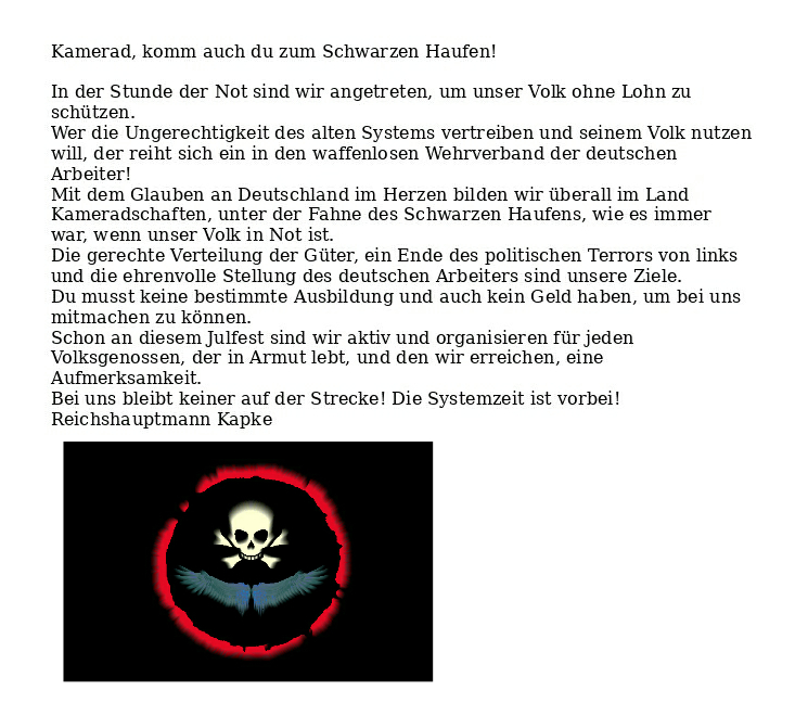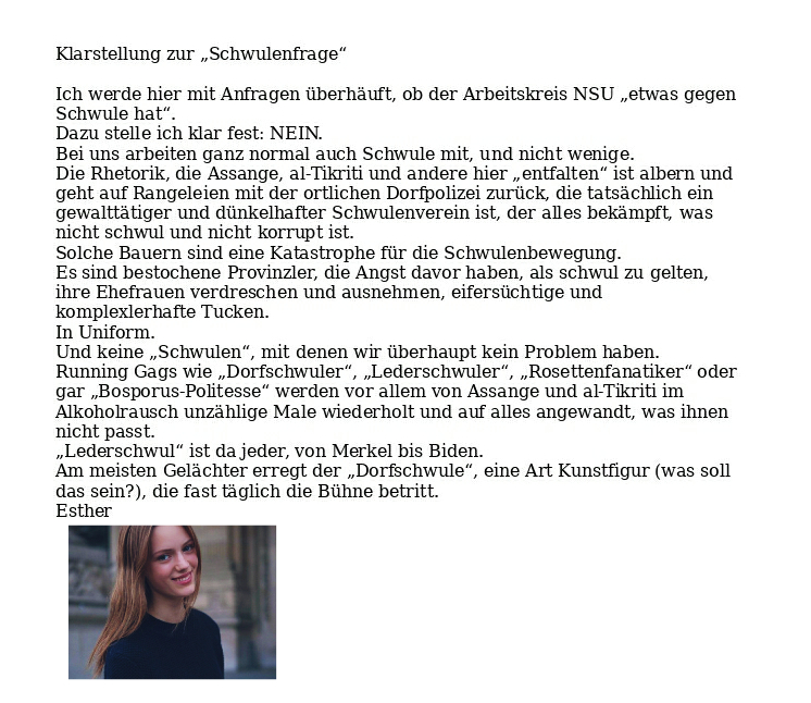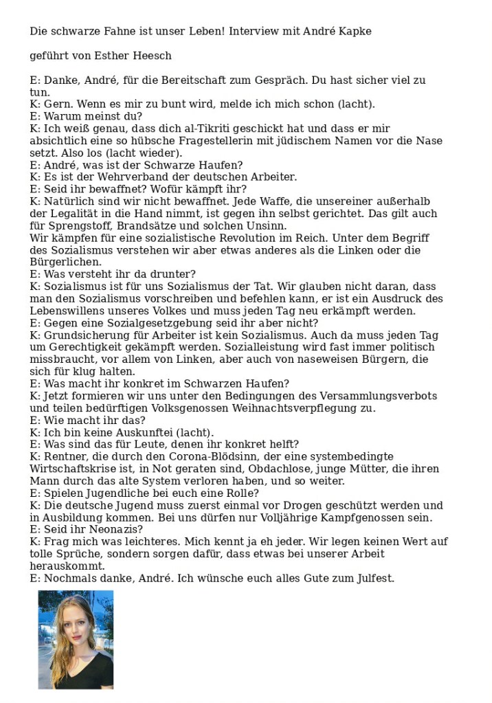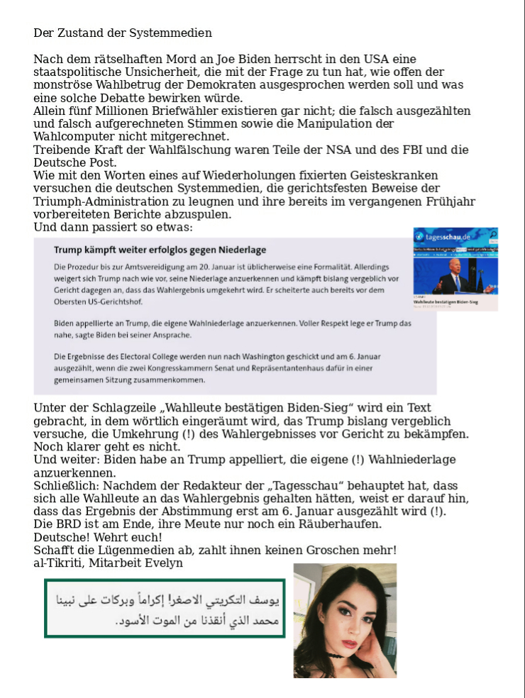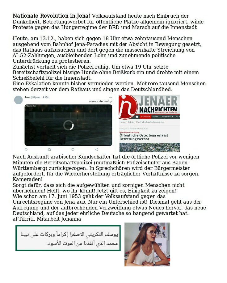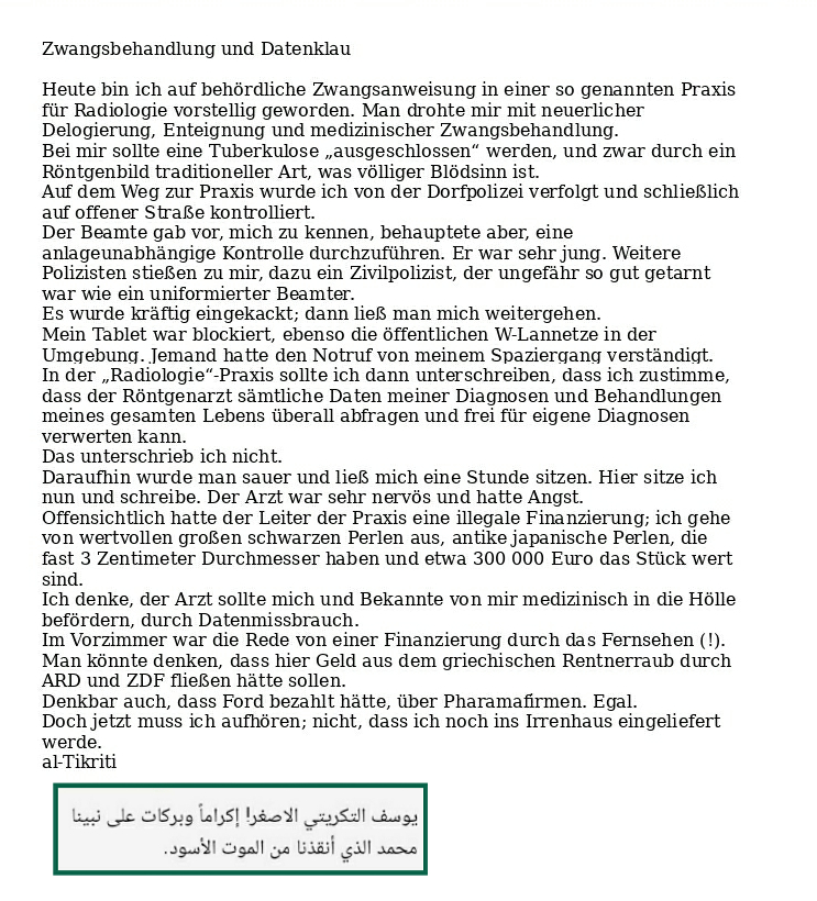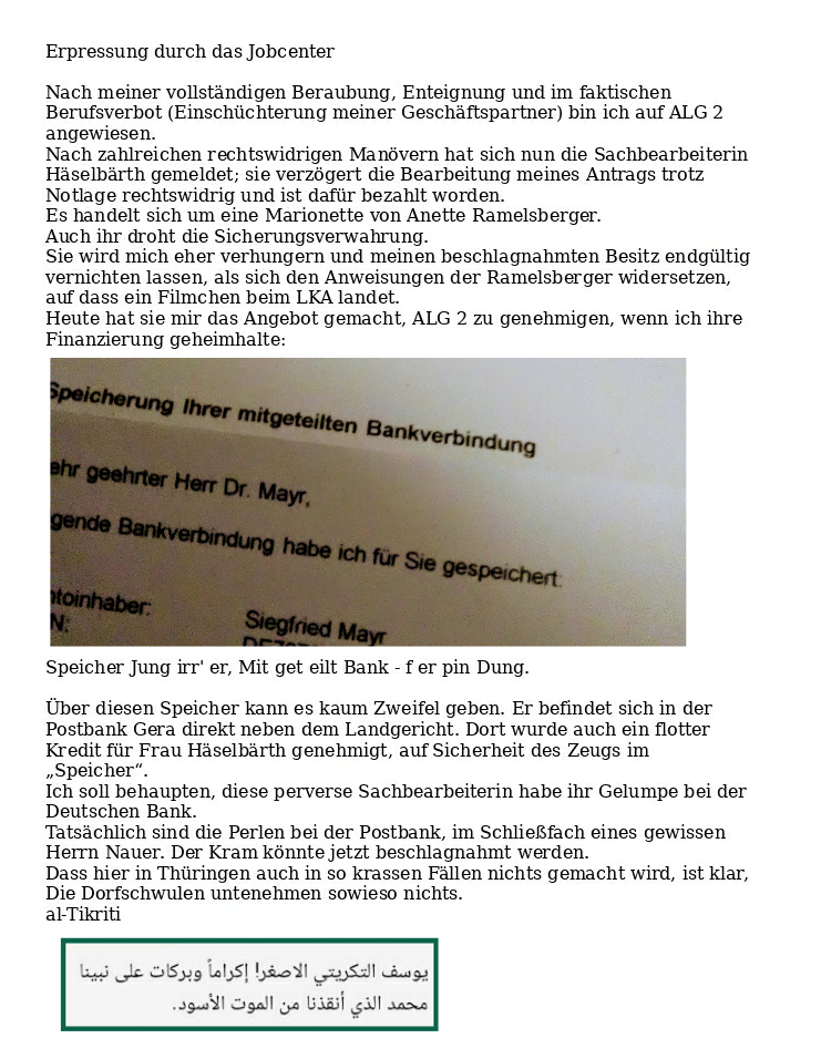 Für den Fall, dass wir den Häftlingen gegen die Giftmischerin helfen, ist die sofortige Wegsperrung von Snowden und al-Tikriti geplant und bezahlt. Eine tschechische Hochstaplerin namens Trommer-Wentzel aus Gera (vorgebliche Irrenärztin, tatsächlich ehemalige Stripperin aus Budweis) soll die beiden umgehend von Pflegern festnehmen und in die Irrenanstalt Stadtroda bringen lassen. Dort soll gemordet werden 🤡 daraus wird jetzt nichts mehr