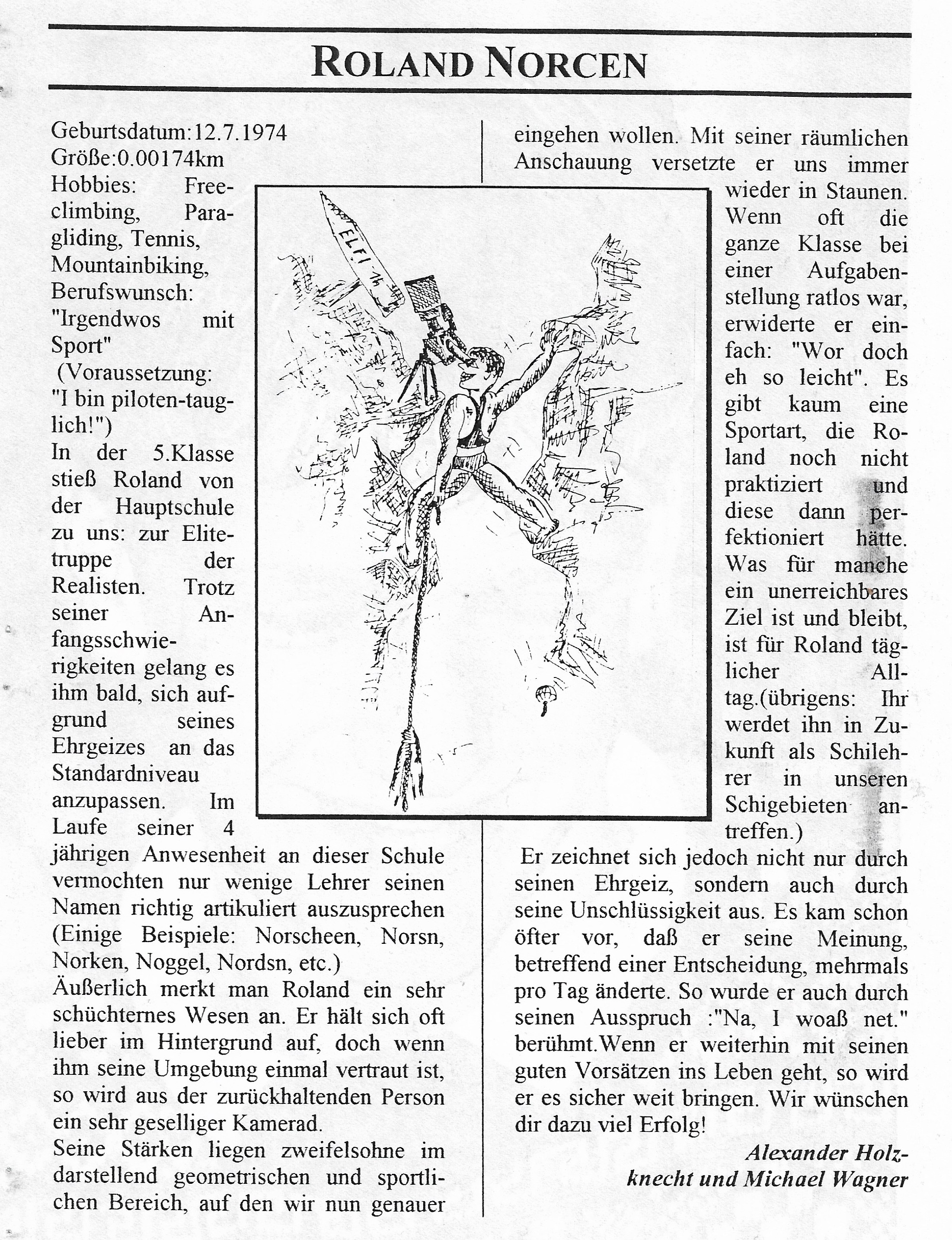Während al-Tikriti Fotos schießt, ein kleines Unterhaltungsprogramm für die Pause (das wir gestern Abend vorbereitet haben). Zunächst ein Foto von Mohamed Mahmoud alias Stefan Berauer aus dem Jahr 1993. Berauer absolvierte nämlich gemeinsam mit unserem Schriftleiter das Abitur. Links ein Artikel aus der damaligen Abiturzeitung, in dem Berauers Charakter geschildert wird. Damals nannte er sich Norcen und verstand sich gut mit al-Tikriti, erst später wurde er von den Israelis angeworben, was bei uns nicht so gut ankommt. Weiter unten eine kleine Radiosendung, die Sie sich anhören können, bis die Leute vor al-Tikritis Tür fotografiert sind. Habakuk 🤡