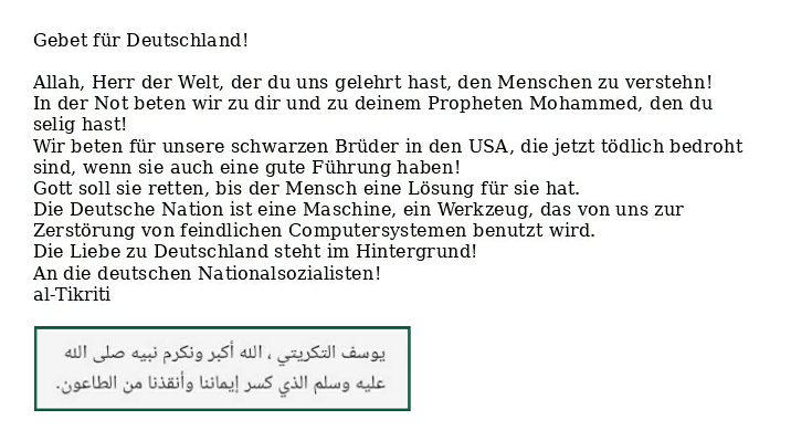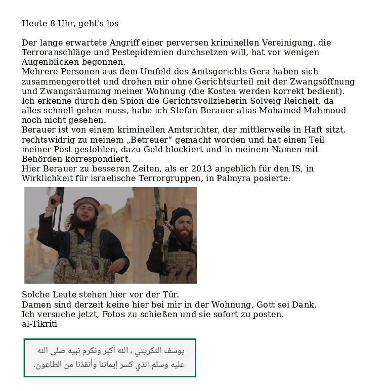 Ein Fax an die Kripo Gera ist draußen; dort wird bereits seit einiger Zeit gezwungenermaßen gegen Berauer/Mahmoud ermittelt, wegen Freiheitsberaubung und Bildung einer kriminellen Vereinigung, das Aktenzeichen lautet dort ST/0261228/2020. An der Tür geht es heiß her, al-Tikriti brüllt mit Berauer herum 🤡, der übrigens bis 2005 als Computerwissenschaftler „Dr. Norcen“ genannt werden konnte.