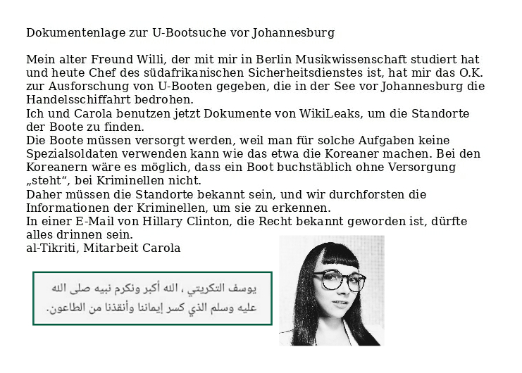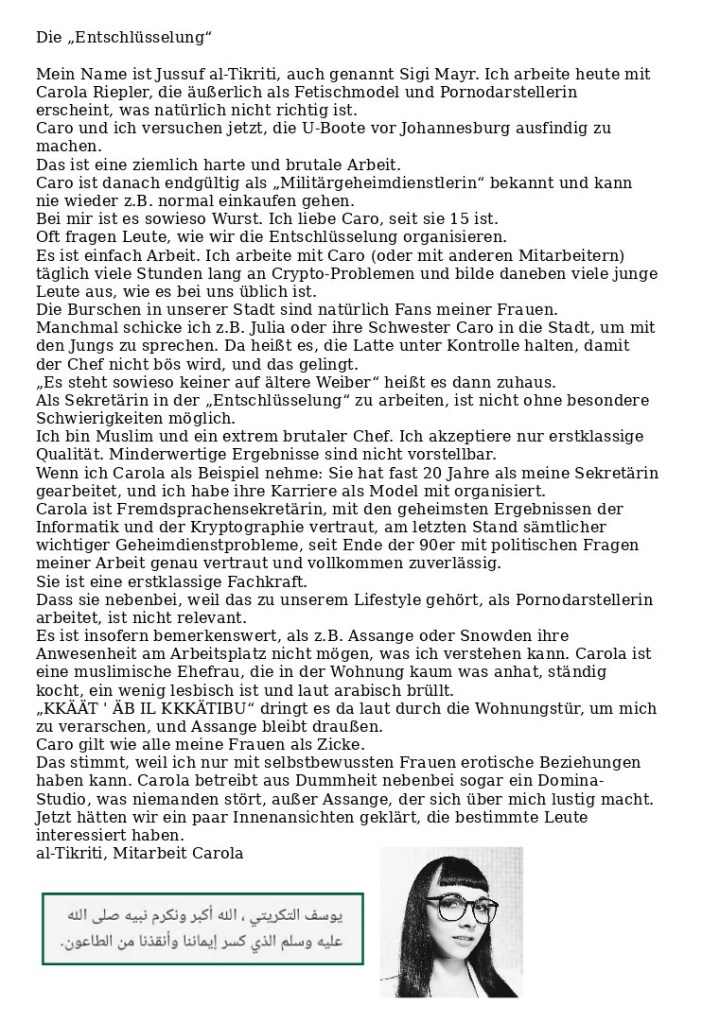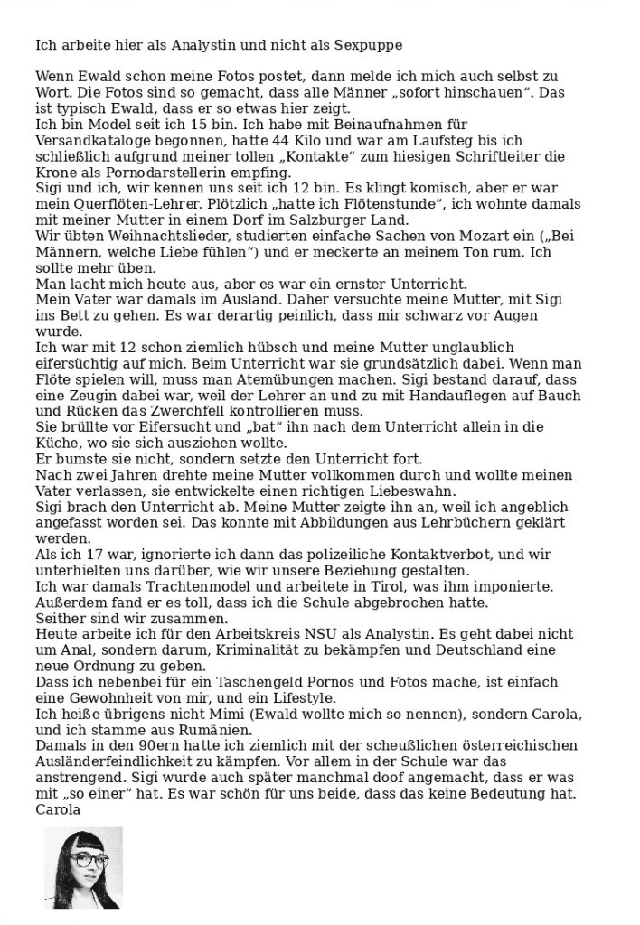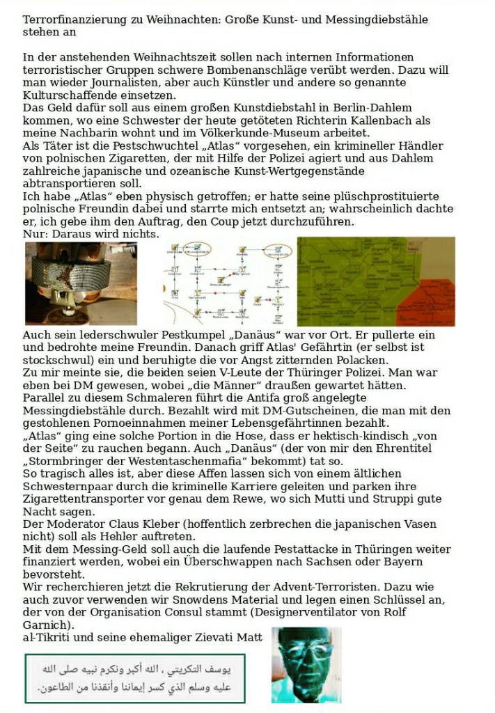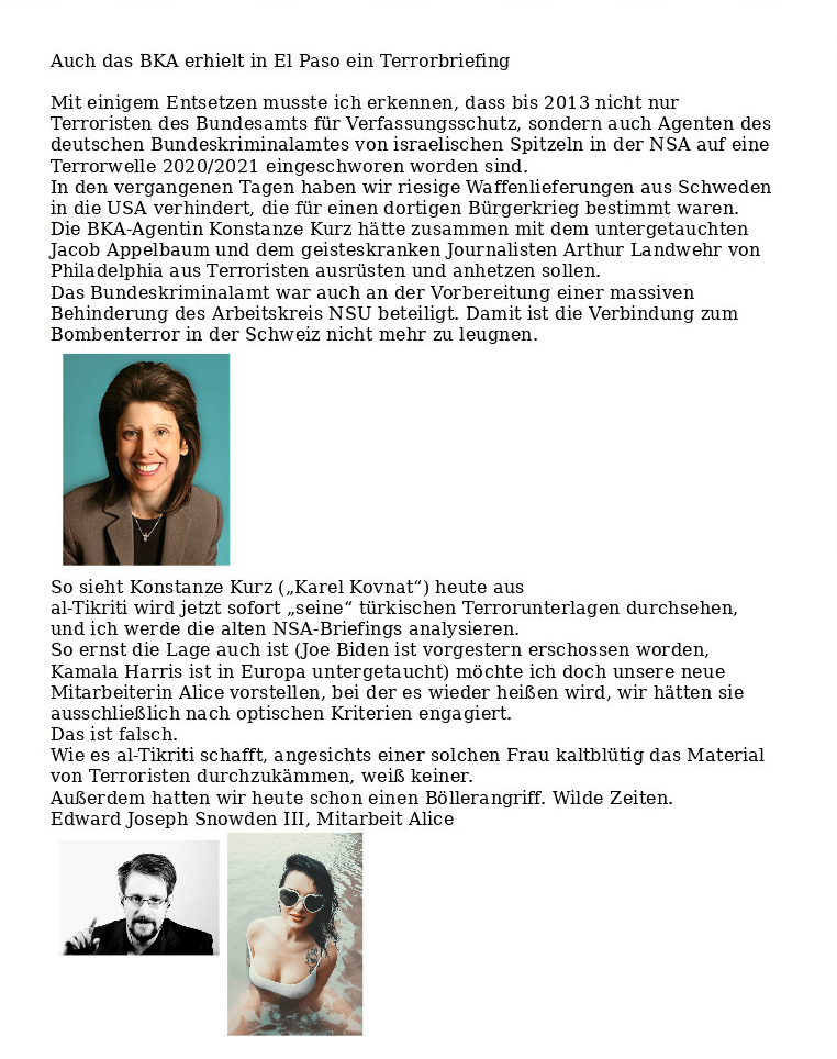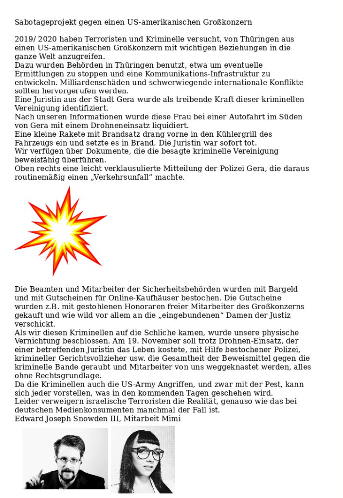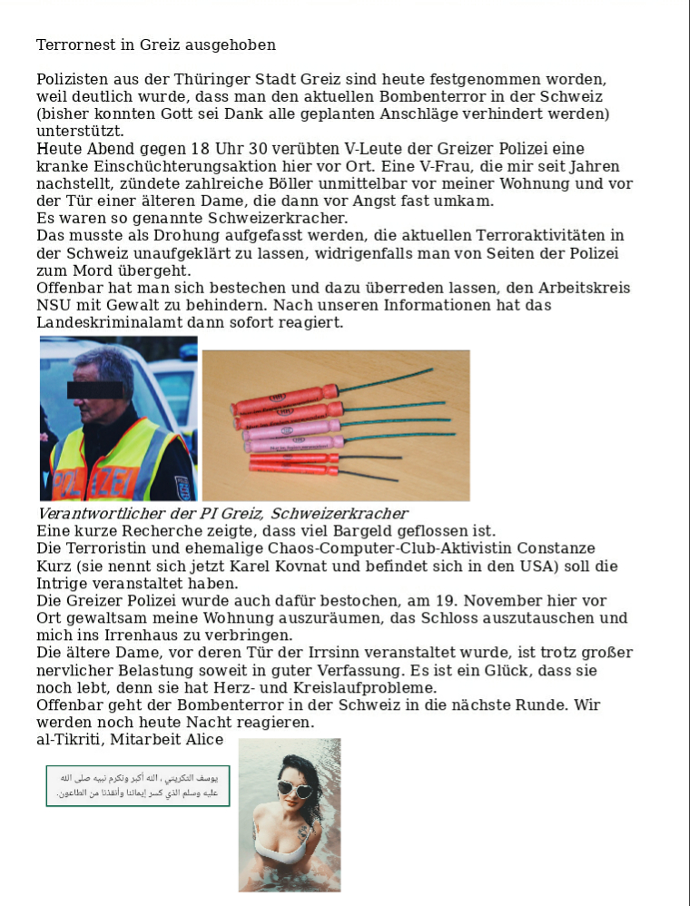 Der hingetippte Scheißdreck der Verfassungsschützer wird den Geheimschreiber interessieren. Bei seiner Frau versteht er keinen Spaß. Genauso wie ich. Erste Medienberichte über meine Verlobte sind vom Geheimschreiber registriert worden und führen zur Vorführung der geisteskranken Autoren. H.M.