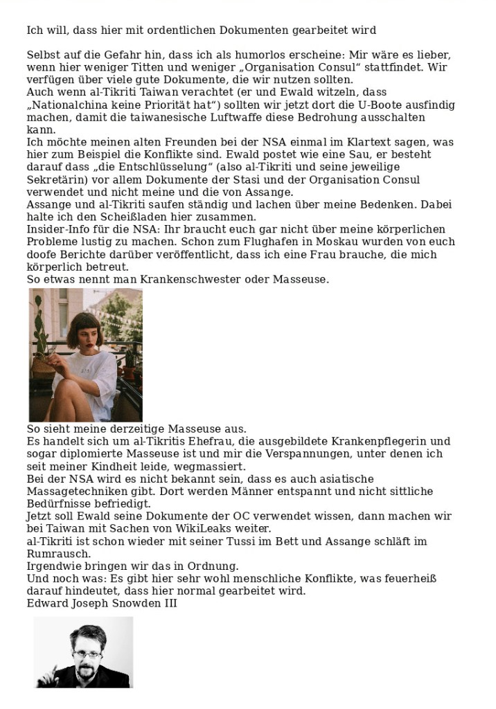 Ich werde heute versuchen, mit dem Arbeitskreis NSU, Harry, Mayr, Assange und Snowden eine Bedrohung vor Taiwan zu klären. Rechts Lori, meine Freundin, links die Domina des Schriftleiters, die angeblich beim Sex ein bisschen Haue will. Es stehen Menschenleben auf dem Spiel. Ewald 🐟