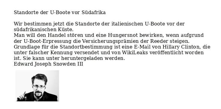 In Südafrika gibt es ein Erpressungsproblem mit den Schifffahrtsversicherungen. Die Prämien steigen sinnlos, weil man mit der Versenkung von Handelsschiffen droht. Die italienischen U-Boote, die man dazu verwendet, machen wir jetzt ausfindig. Wenn das nicht gelingt, verhungern die Menschen in Südafrika. 🐟