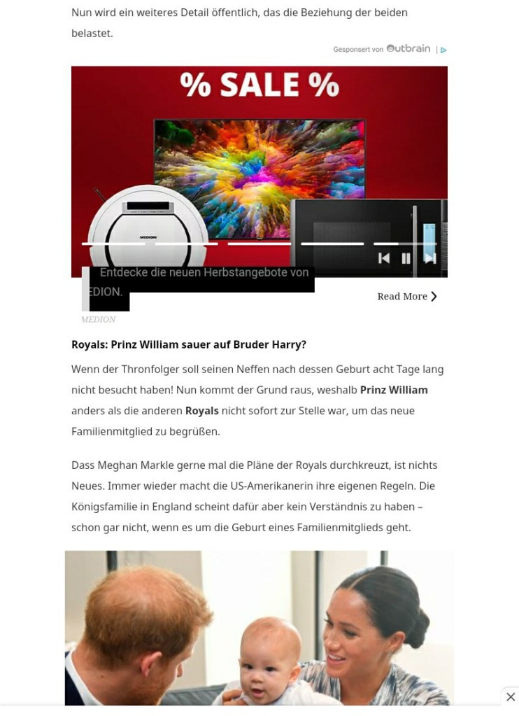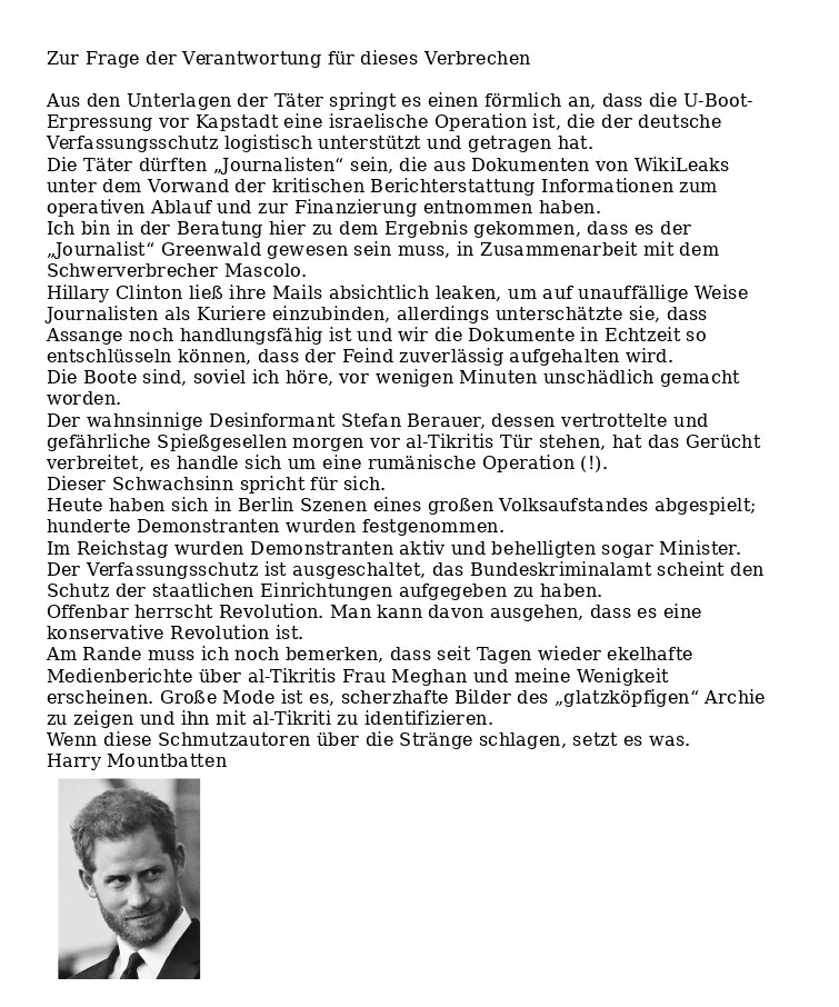 Der deutsche Verfassungsschutz hat in den letzten Tagen über die Stränge geschlagen. Ich (Prinz Mountbatten) bin kurz davor, den Klüngel vom Geheimschreiber wegputzen zu lassen. Derzeit werden Phantasien verbreitet, die besagen, dass ich mit William Stress hätte. al-Tikritis Frau Meghan, die sogar während der offiziellen Hochzeit mit mir engen, herzlichen Kontakt zu al-Tikriti hatte, erscheint in den Medien als meine Partnerin, was Käse ist. Die Scheiße des Verfassungsschutzes hier: