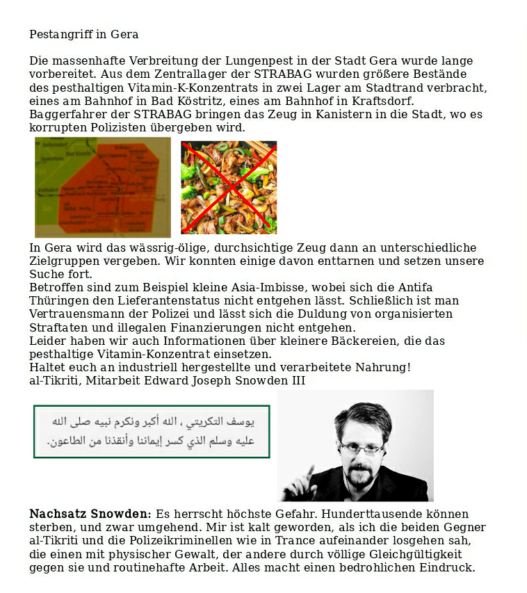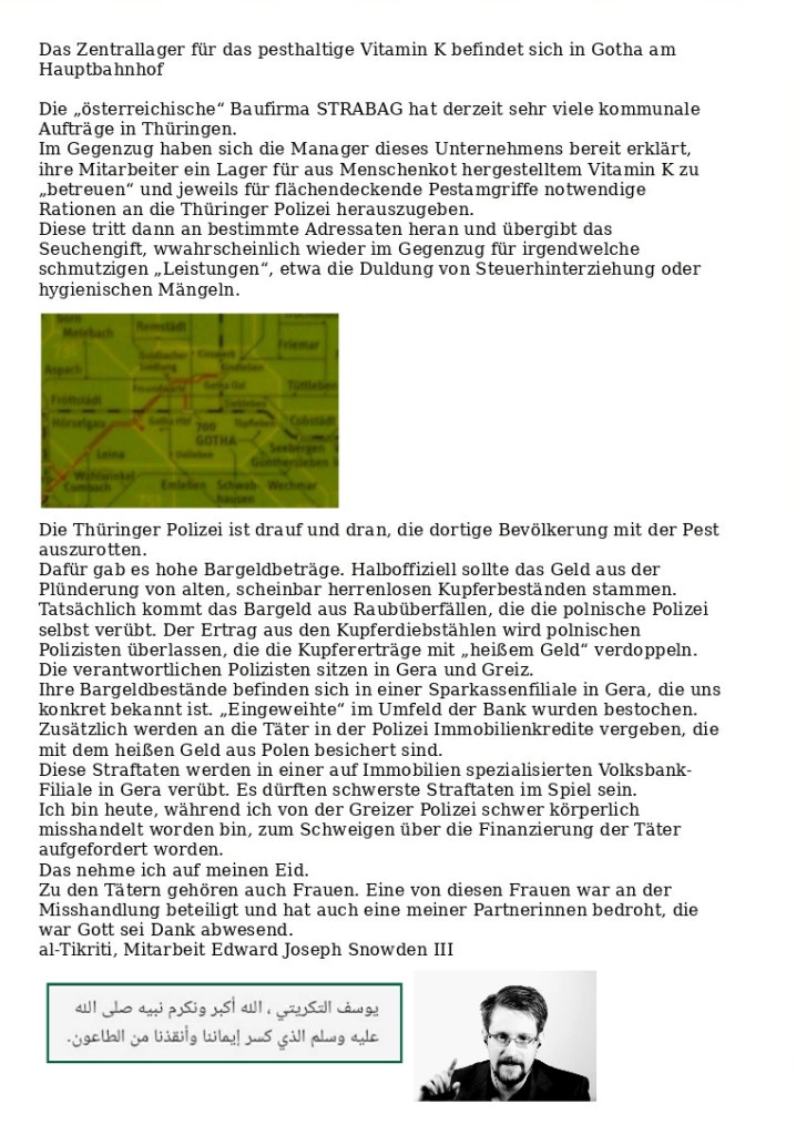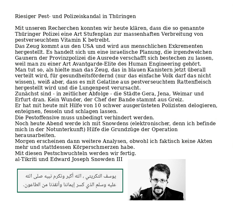 Lederschwule der Thüringer Polizei versuchen in diesem Moment, uns zu blockieren, weil wir im Hauptquartier von Amazon in Seattle eine Pestfabrik (Rattenfleisch für Aale, die dann Pest übertragen) gefunden haben. Das Zeug soll an Rekruten der US-Army gehen. Lobbyisten des Thüringer Umweltministeriums und von TÜV Rheinland stehen bereit, um sich unter Berufung auf uns als Lobbyisten zu betätigen und das entdeckte Pestfleisch über Minenfelder in Texas nach Brasilien zu schleusen. Näheres in Kürze. Snowden
