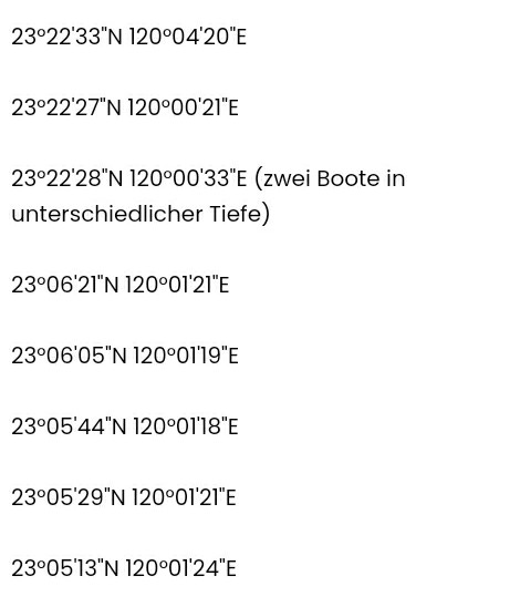Die Boote sind funkstill und können nicht geortet werden. Die taiwanesische Luftwaffe wird in wenigen Minuten Wasserbomben mit großen Transporthubschraubern auf die Boote werfen. Die Hubschrauber sind von der chinesischen Armee geleast worden. E. 🐟